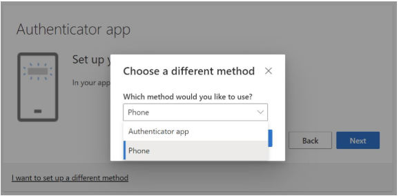 You can set up your two-factor authentication by using the Microsoft Authenticator app or select SMS as your preferred authentication method.