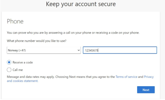 - Select your country code, enter your phone number, then click “Next”.